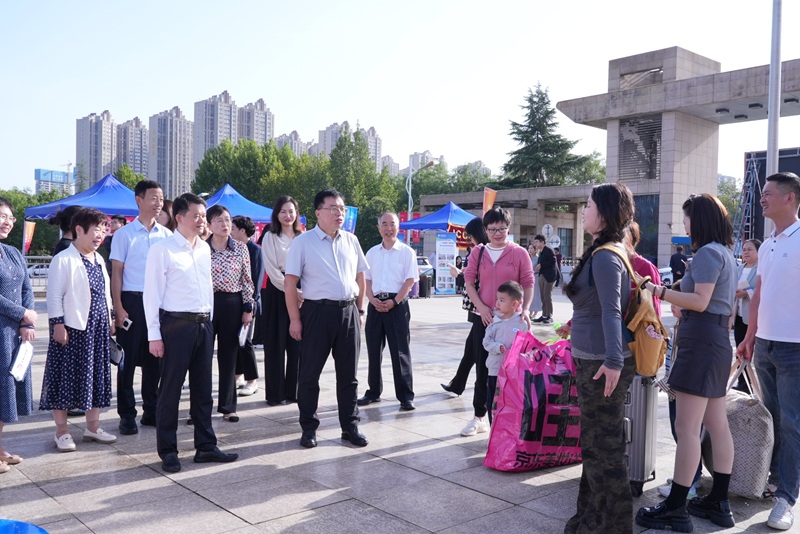 在迎新现场,校领导一行仔细查看各学院准备的迎新相关资料,详细询问新生报到进度,深入了解相关部门及各学院迎新工作的新做法、新举措,并与新生及家长热情交流。